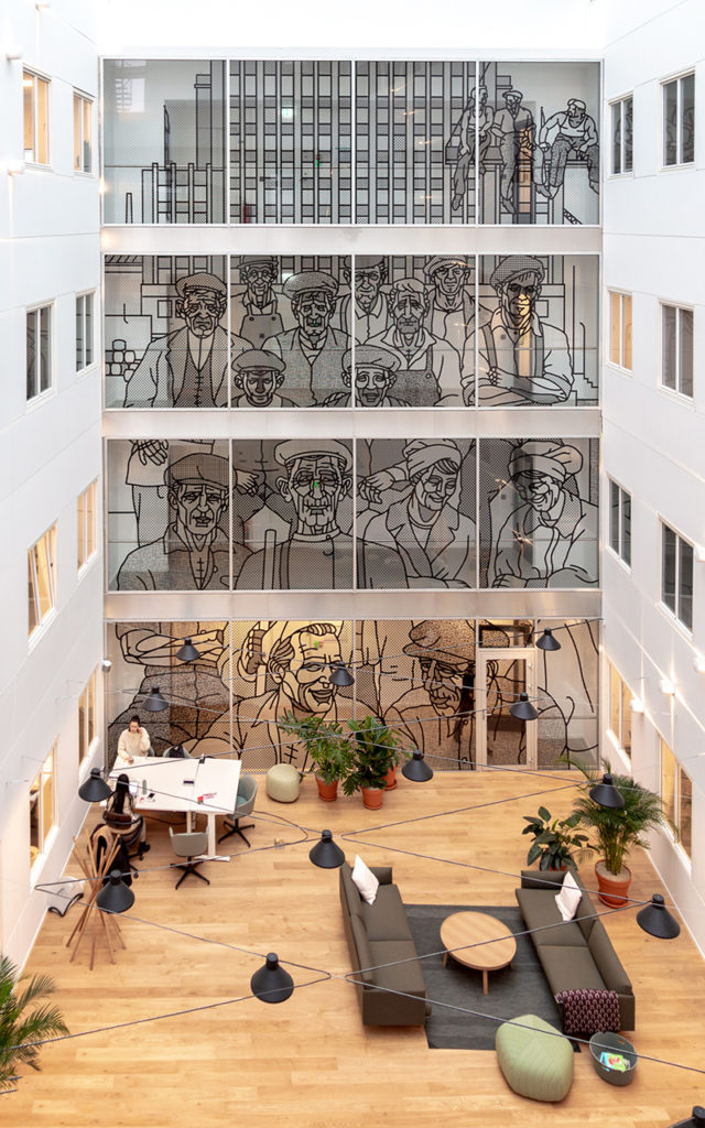 Utvendig har Spaces fått fine fasadeskilt, hvor det ene skiltet ‘bretter’ seg rundt fasaden på bygget. Med sin unaturlige form skaper skiltet oppmerksomhet i bybildet.Innvendig har vi dekorert vinduer over flere etasjer, med flotte illustrasjoner, tegnet av dyktige illustratører fra kollektivet ByHands. Illustrasjonene går over fire etasjer, og skaper et skikkelig blikkfang innover i lokalet mot atrium. Vegg- og vindusdekor printet på folie er en enkel og kostnadseffektiv måte å dekorere kontorlokalene på.